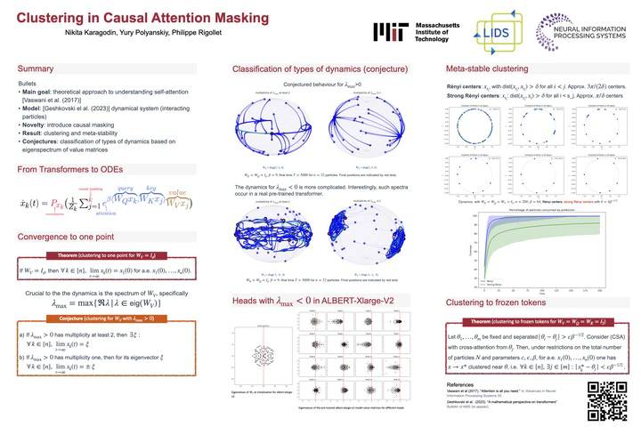 I am happy to present my first graduate paper Clustering in Causal Attention Masking as a poster at NeurIPS 2024. The main goal of this work is to better understand self-attention from theoretical perspective, by modeling propagation of tokens through layers as an interacting particle system.